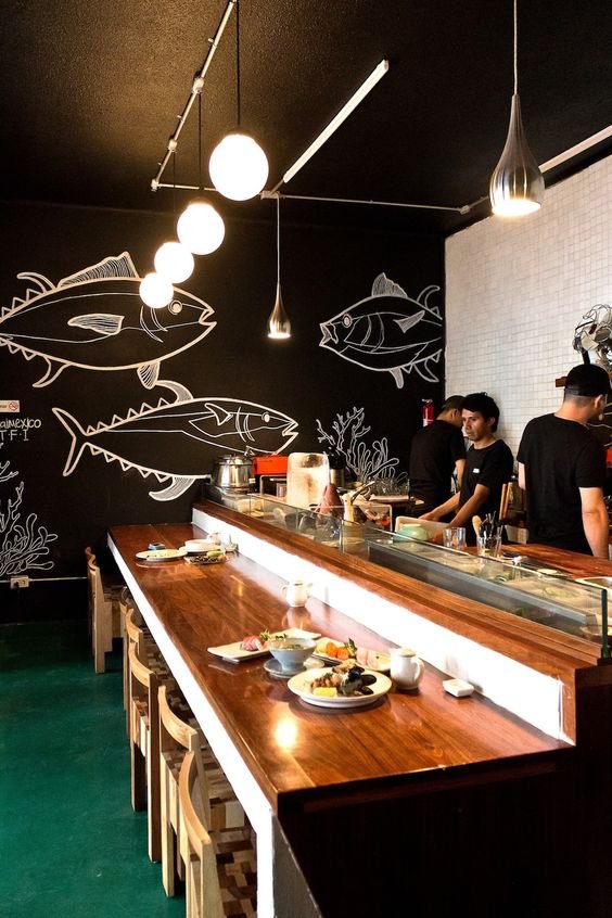 Đừng quên trang trí cho những bức tường trong nhà hàng của bạn. Tranh ảnh hoặc vẽ tường nhẹ nhàng về văn hóa Nhật Bản là một gợi ý rất thực tế. Kết hợp giá kệ, vài chậu cây cùng với hệ thống ánh sáng. Điều này sẽ làm tăng tính thẩm mỹ và tạo ấn tượng độc đáo cho nhà hàng.